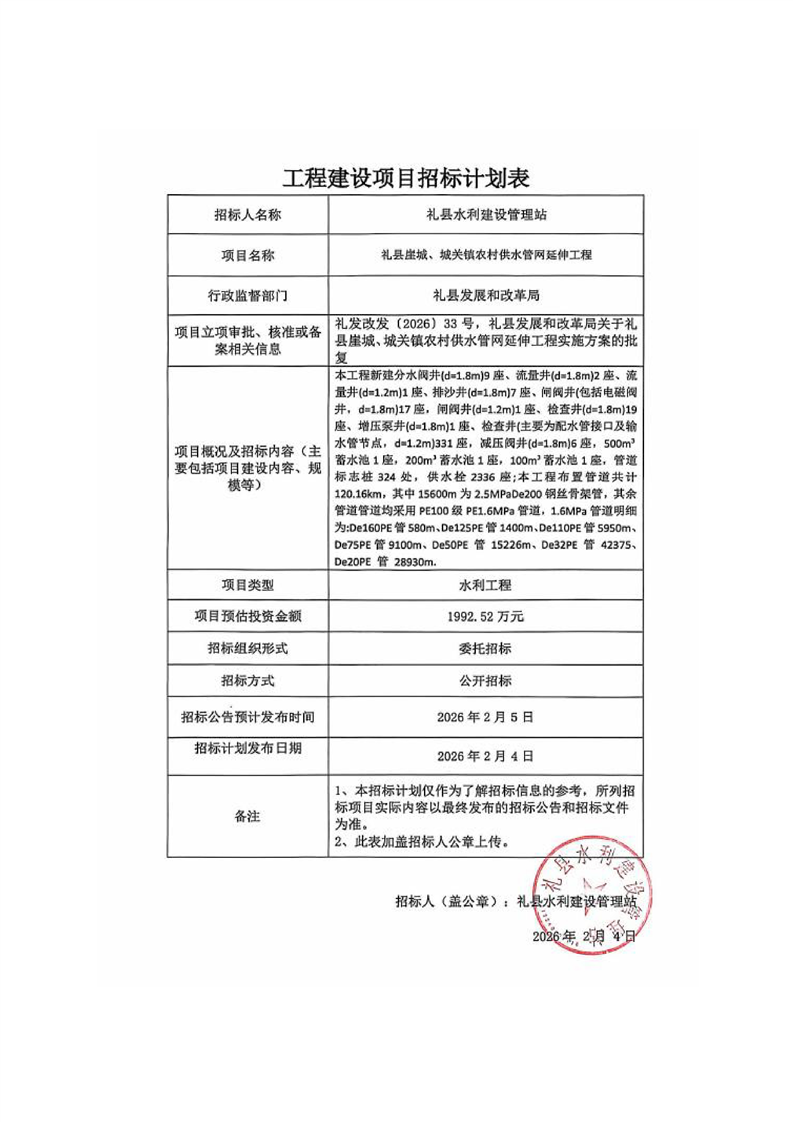禮縣崖城、城關(guān)鎮(zhèn)農(nóng)村供水管網(wǎng)延伸工程