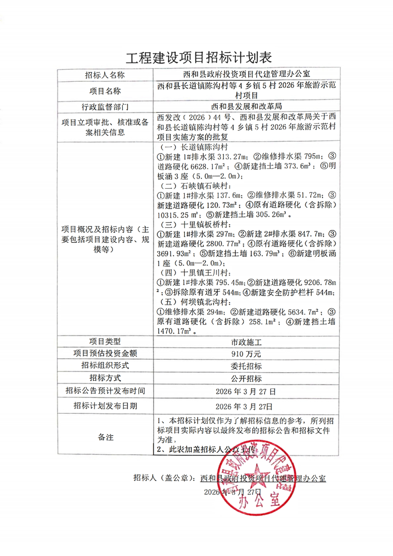 西和縣長道鎮(zhèn)陳溝村等4鄉(xiāng)鎮(zhèn)5村2026年旅游示范村項目
