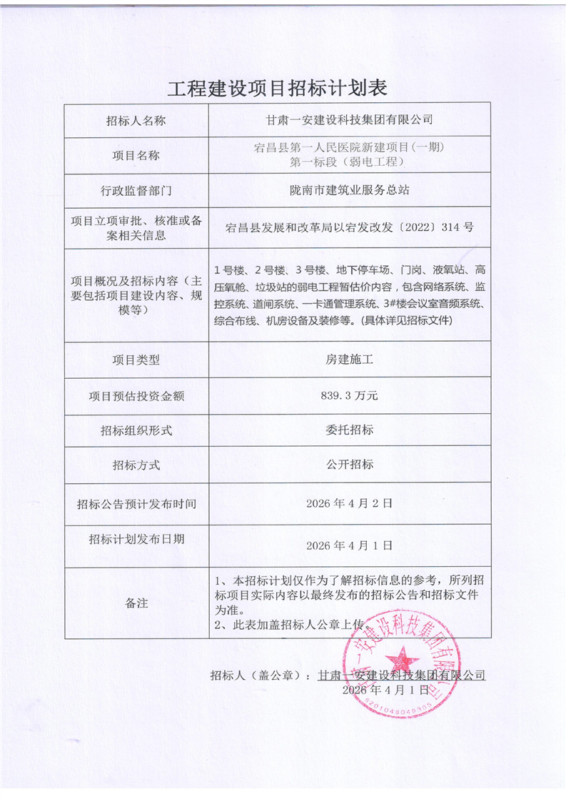 宕昌縣第一人民醫(yī)院新建項目(一期)第一標(biāo)段(弱電工程)