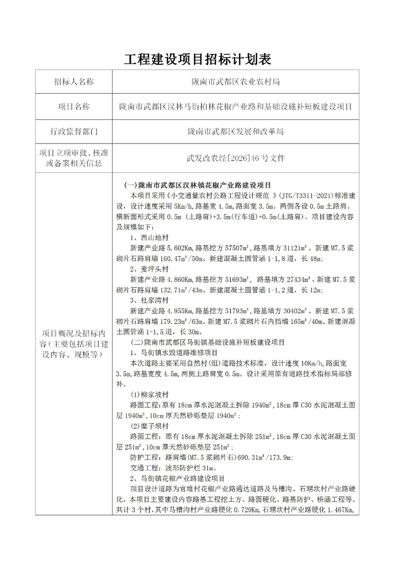 隴南市武都區(qū)漢林馬街柏林花椒產(chǎn)業(yè)路和基礎設施補短板建設項目